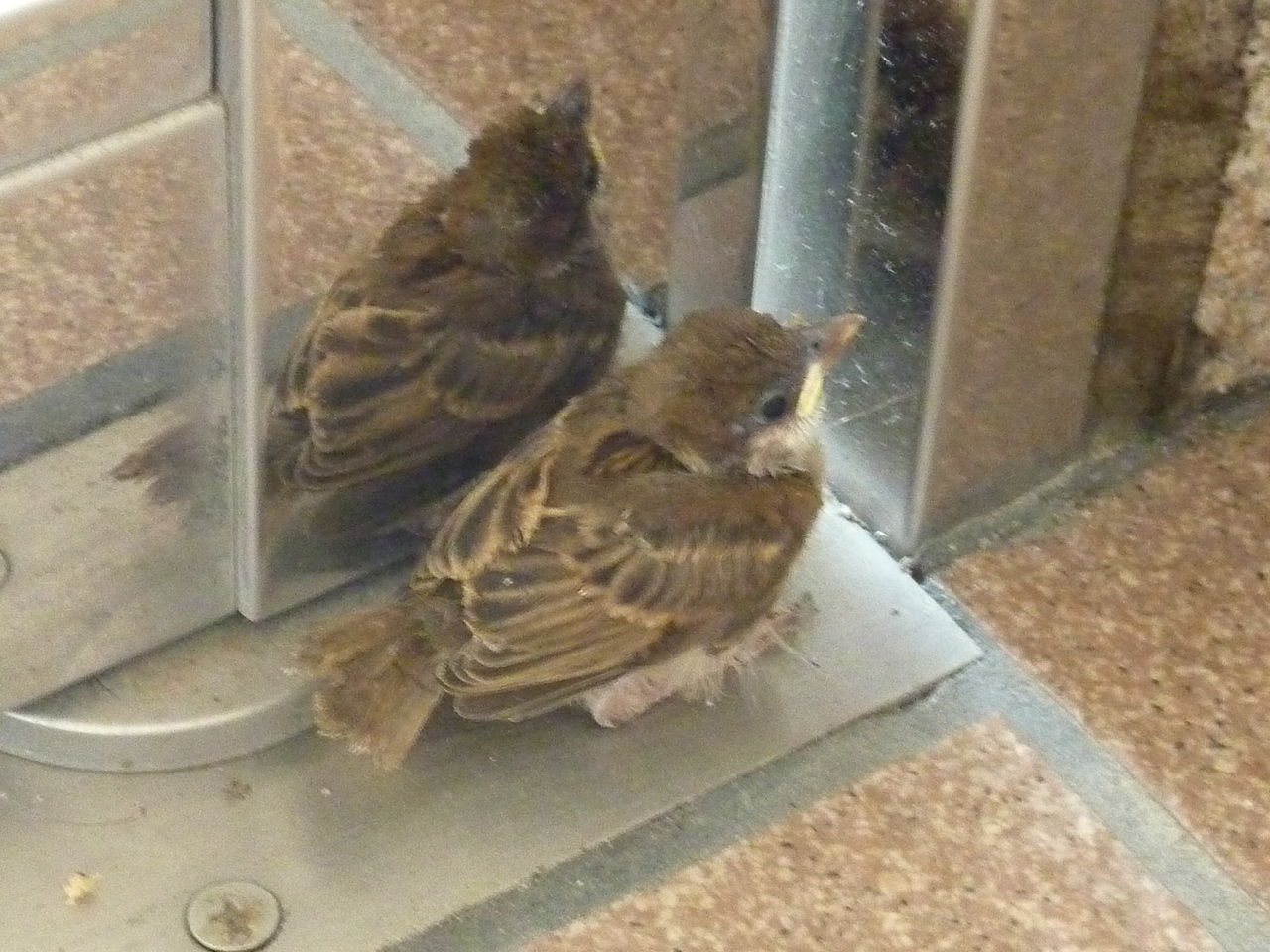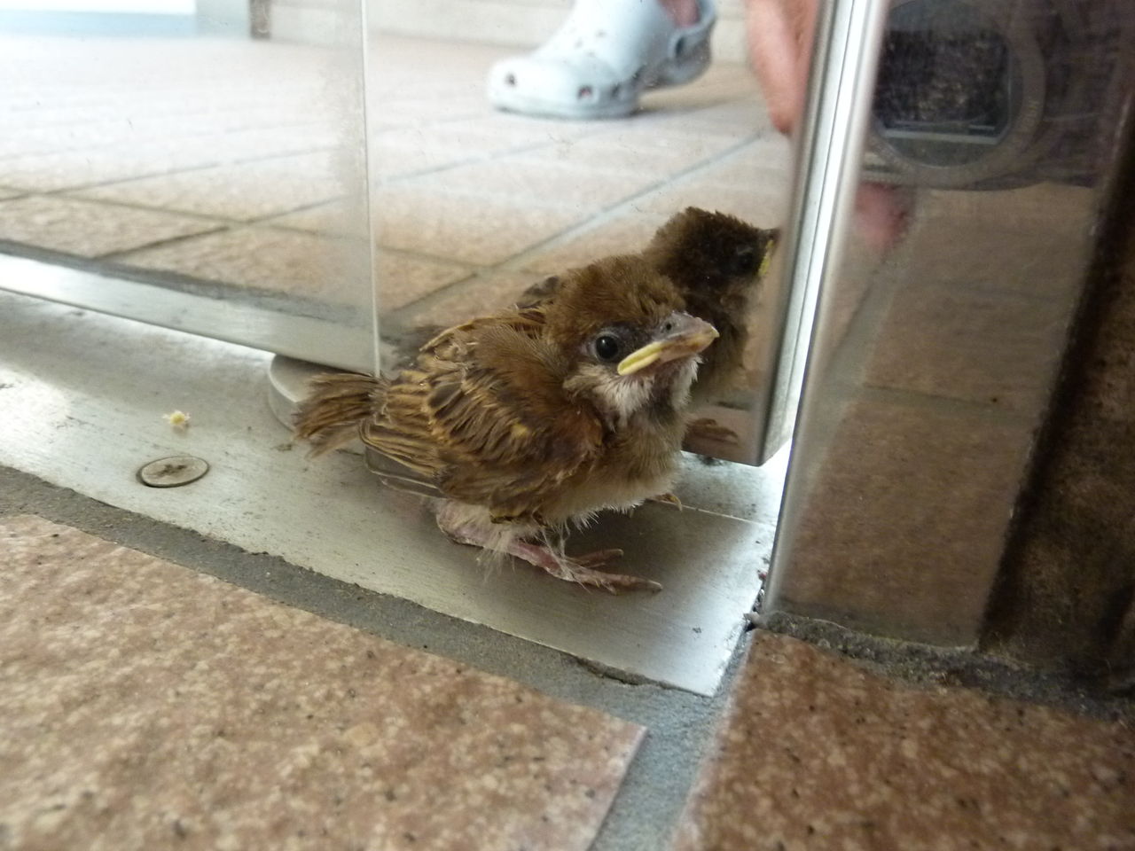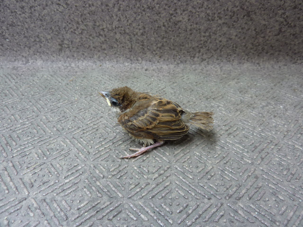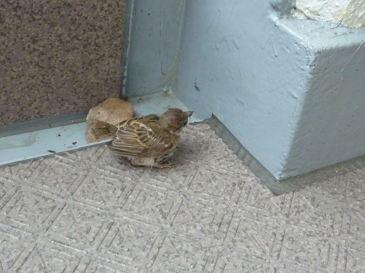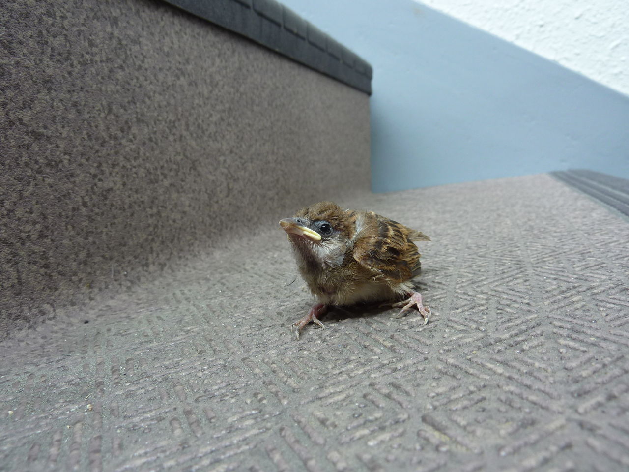 I found a sparrow in the passageway of my apartment. As I followed it, it went away to the entrance of the apartment house. It only bounced away, looked too little to fly.