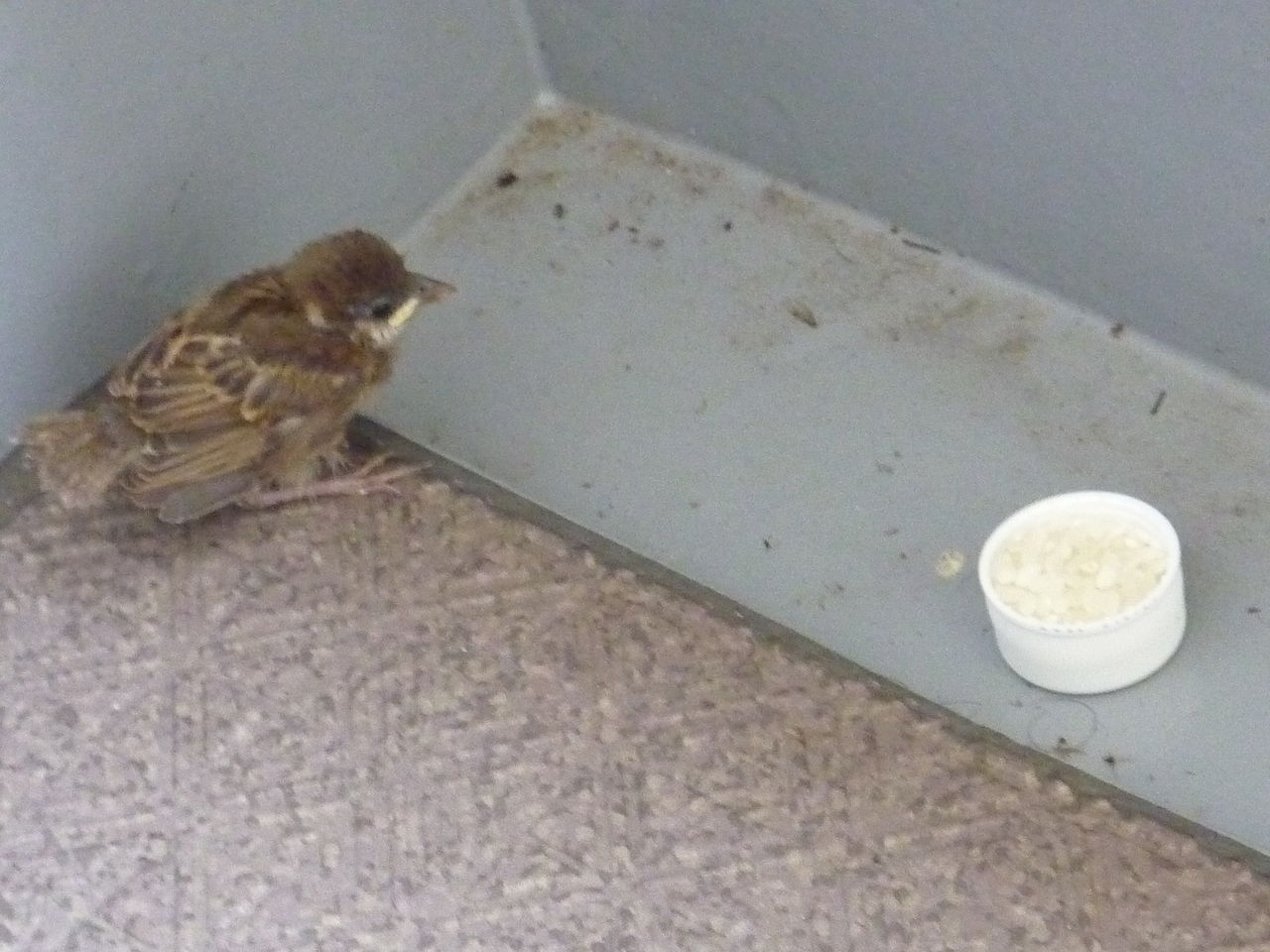 I assumed it was hungry. I put some rice in a cap of a plastic bottle and gave it to the birdie, but it seemed afraid to eat the rice.