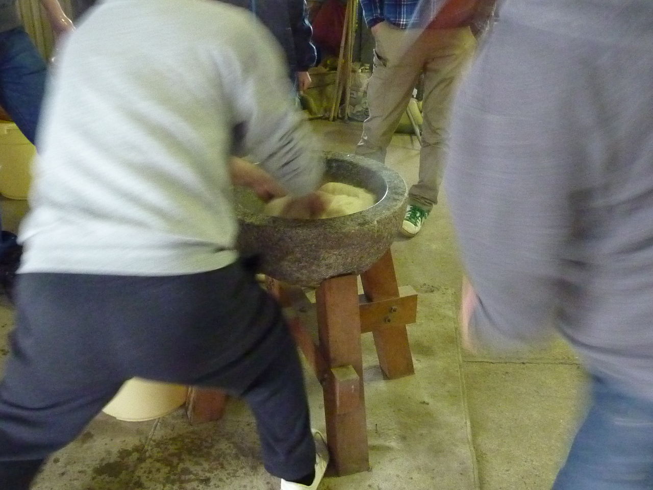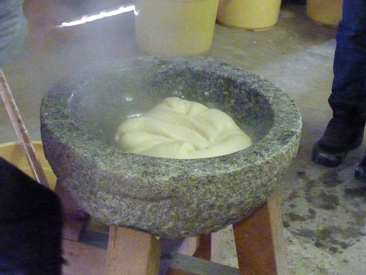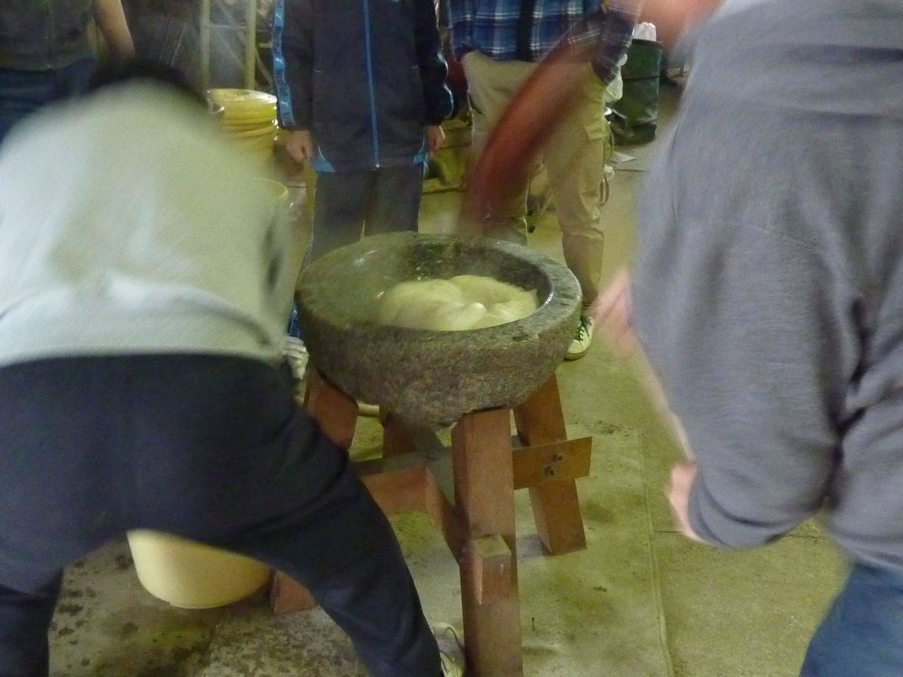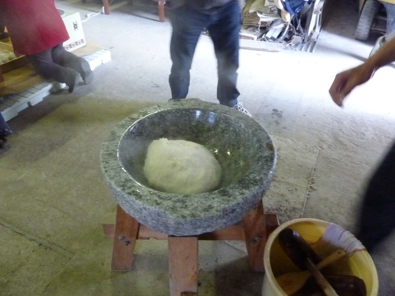 こうやってある程度こねた餅米を石臼に移します。