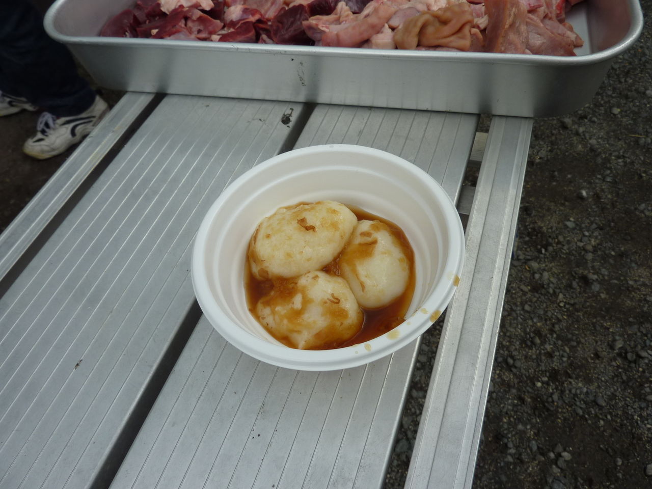 It was time for lunch. The freshly-pounded rice cakes are dipped in soy sauce with grated radish in it.