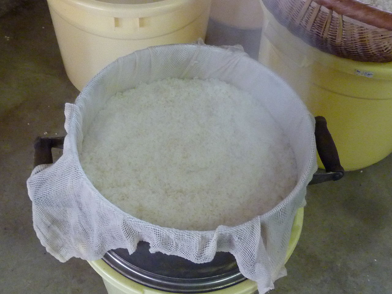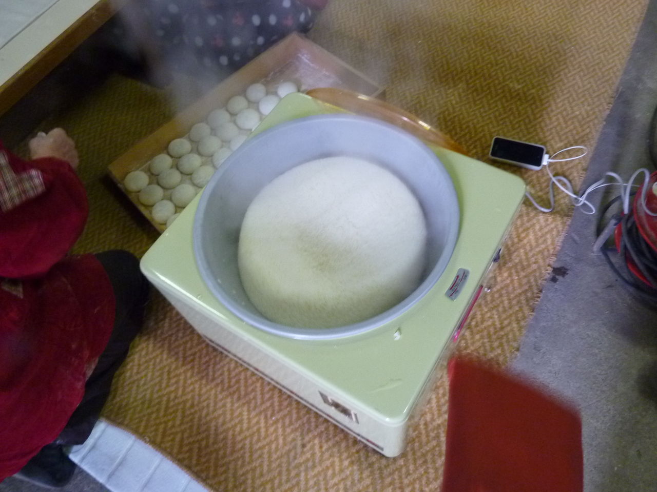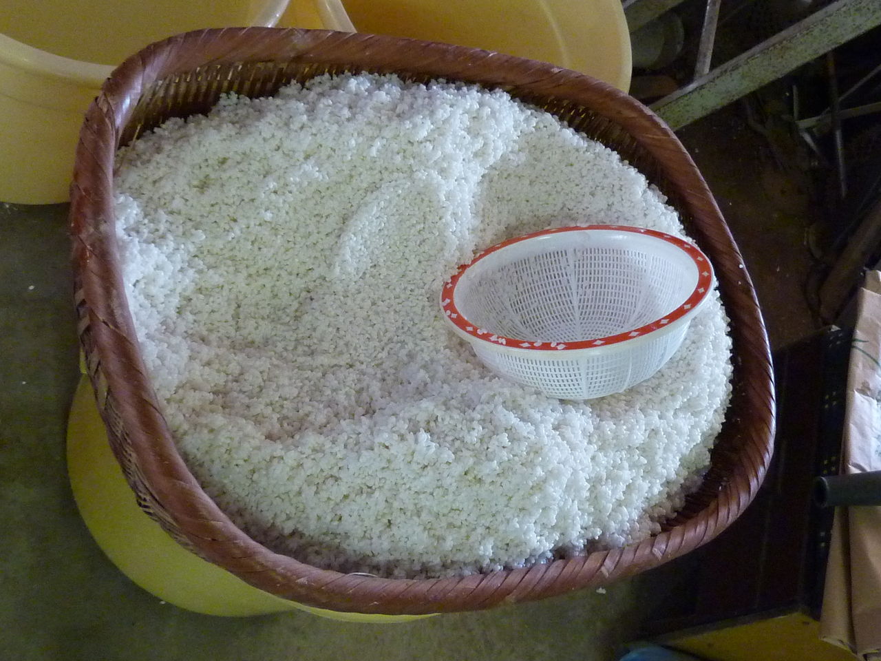 The procedures except for steaming the rice are done in a barn. It was cold in there because of the cold air outside. I had a clock with a thermometer and checked the temperature with it. It was cold below 3C.