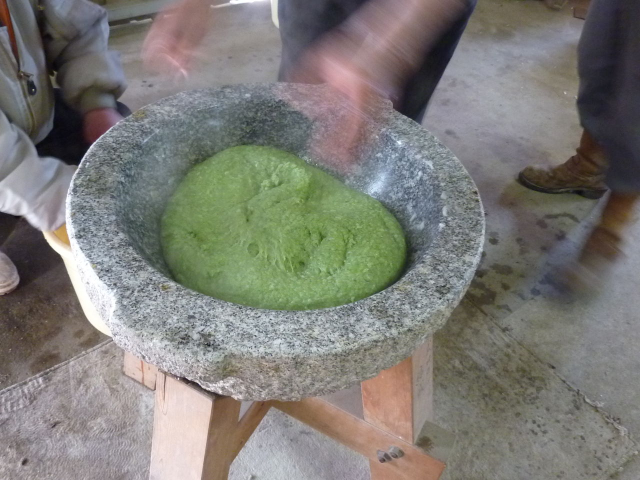 Yomogi is mixed evenly as it's pounded.