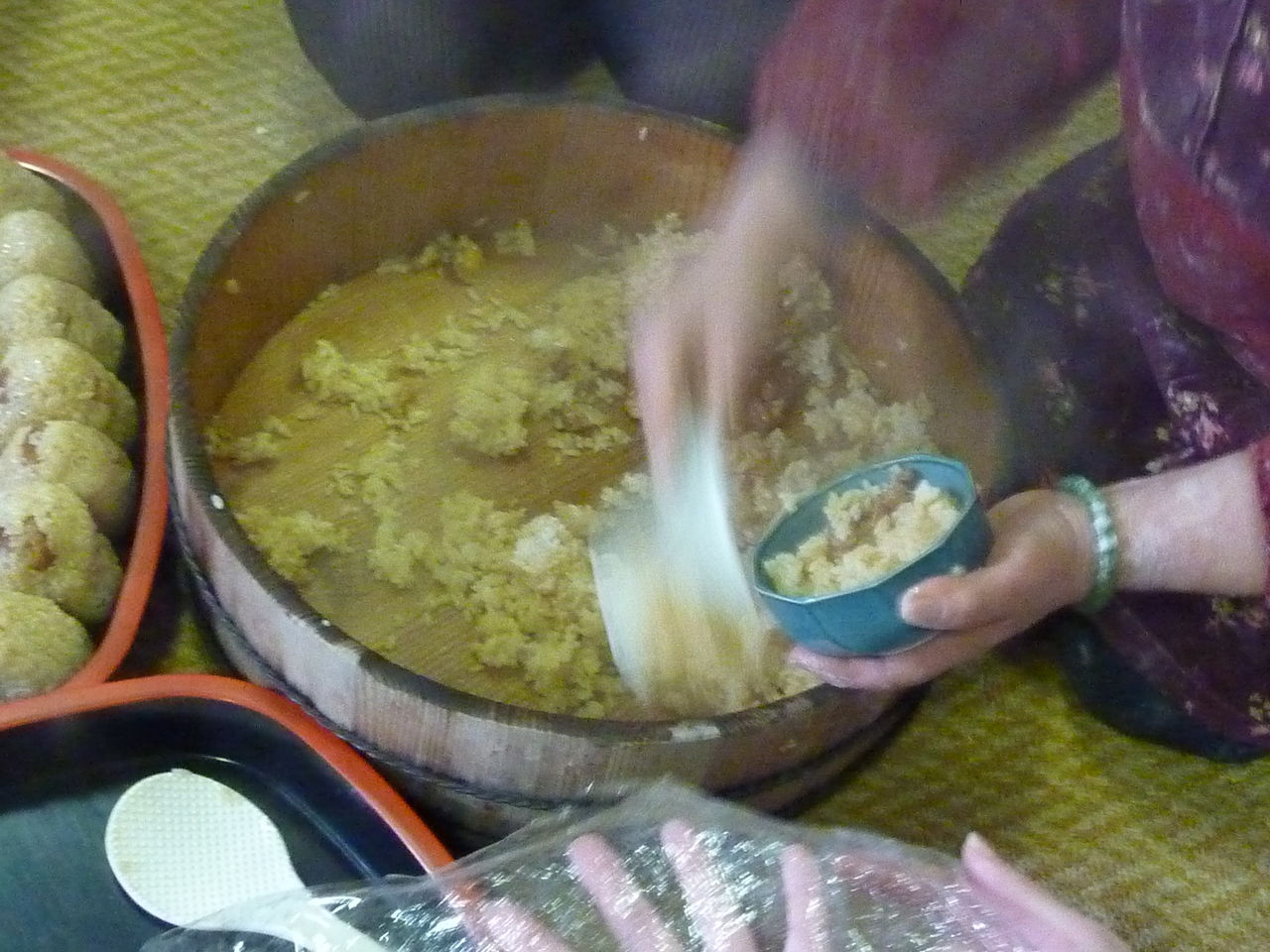 Pounded rice is moved to the table.