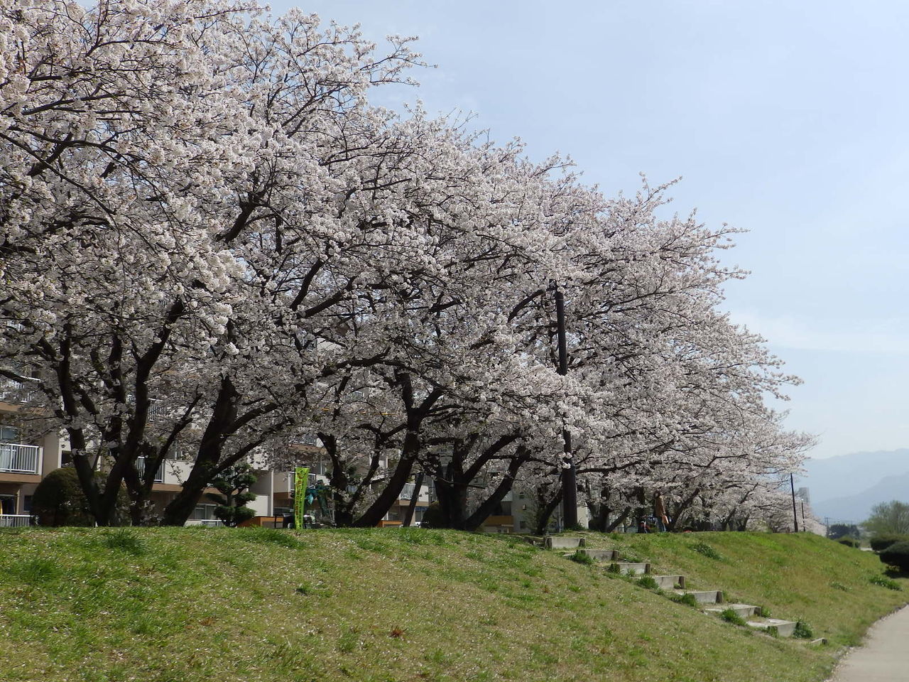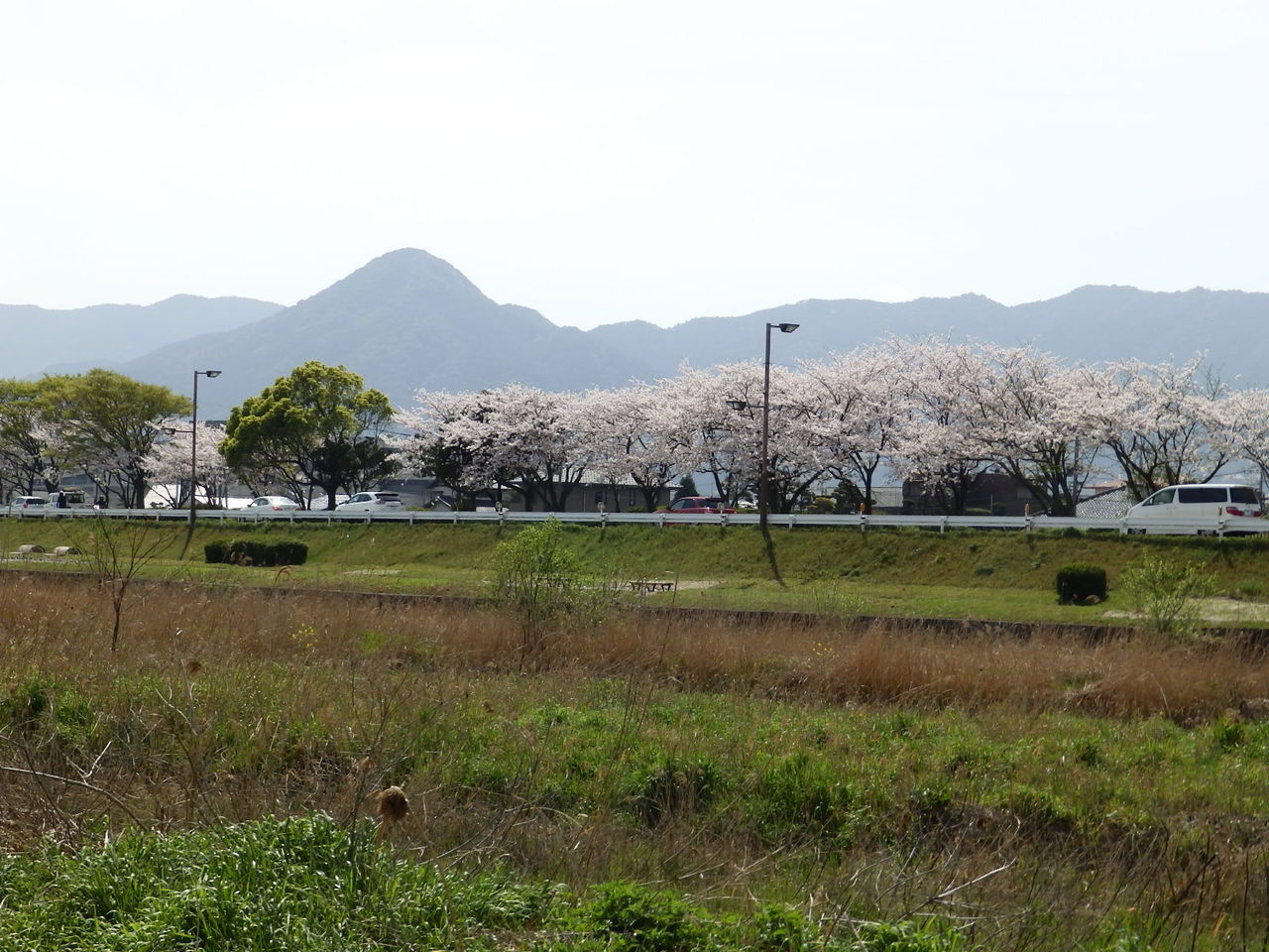 対岸にも桜が植わってます。向こうに見える山は飯盛山です。