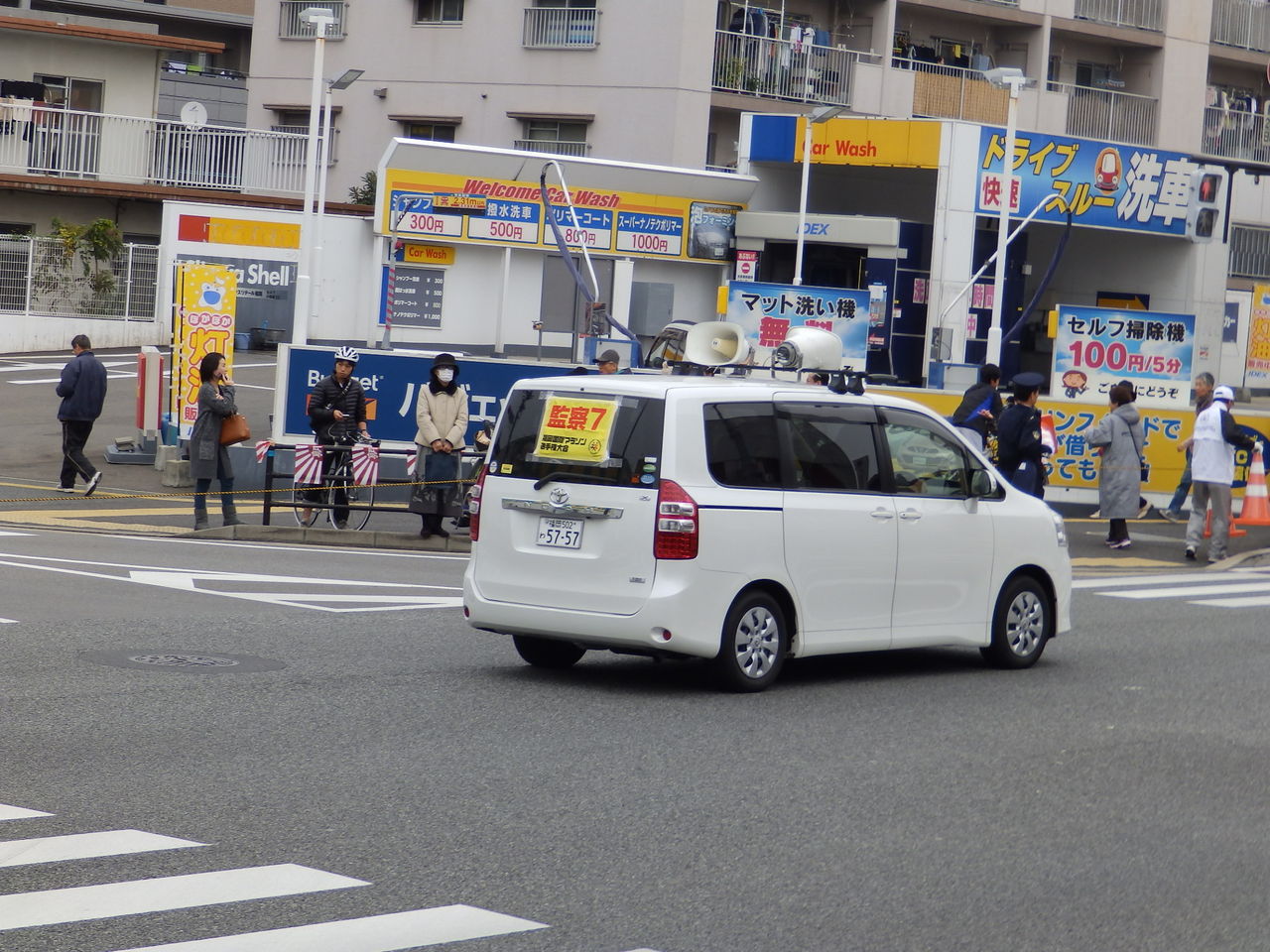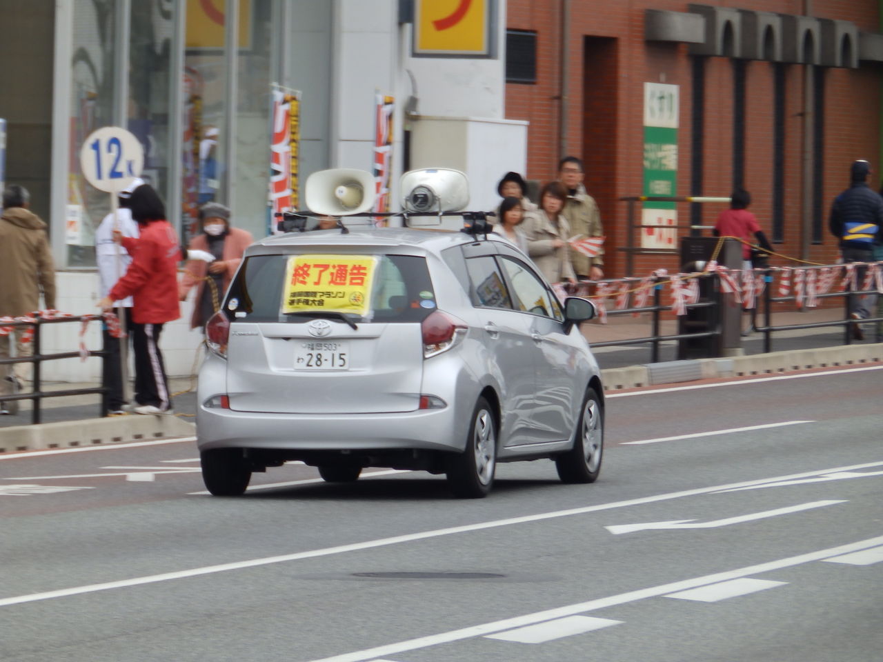 この車が福岡国際マラソンの隊列が通過したことを通知して行きます。公道を40kmくらいずっとスピーカで伝えていくんでしょうね。