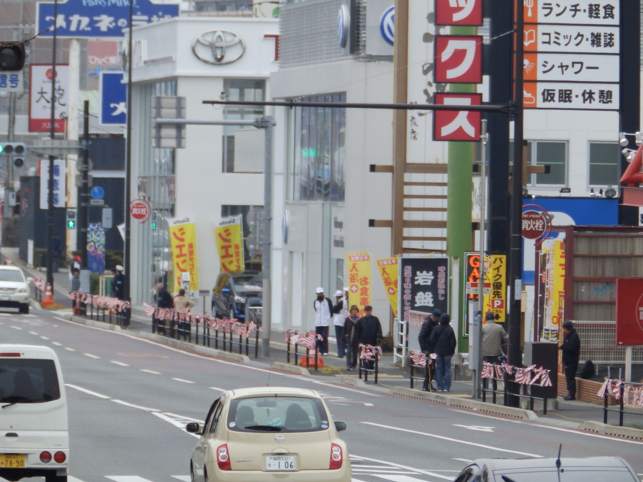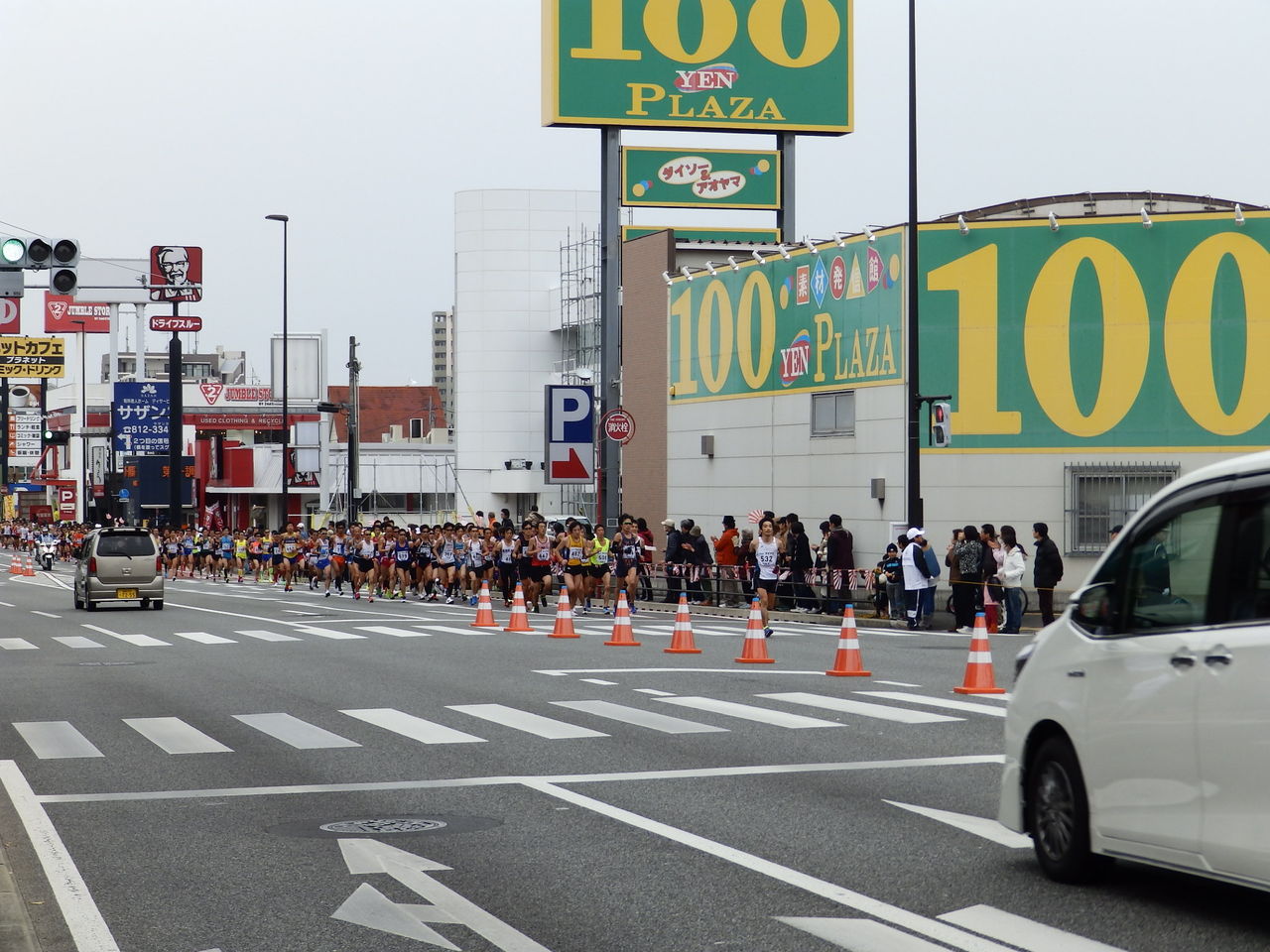 東へ向かう選手が走る国道202号の北側から見物するつもりでしたが部屋でもたもたしてしまって、先頭集団が10kmを過ぎた辺りから部屋を飛び出してコースに向かいましたが、道路はすでに横断できない状態となっていました。仕方ないので今年は選手が走行する反対側から見物しました。
