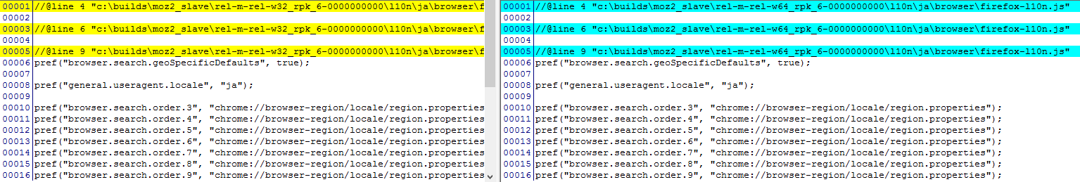 今回の43.0.4版の公開ディレクトリのhttp://releases.mozilla.org/pub/firefox/releases/43.0.4/を見るとwin32以外にもwin64のディレクトリもあるのを見つけました。おそらく64ビット版Windows用のものと思いますが、FirefoxではなくWaterfoxを使っているのは使っているPCが64ビット版だからなので64ビット版の方がより適切なのではないかと思いました。そこで、win64のja.xpiと既にインストールしたwin32のja.xpiをダウンロードしなおして保存し差分を見てみることにしました。xpiファイルはzip圧縮されたアーカイブなのでそれぞれをunzipして比較してみました。すると中のbrowser/defaults/preferences/firefox-l10n.jsというファイルで次のような差分がありました。(DFでの表示です)