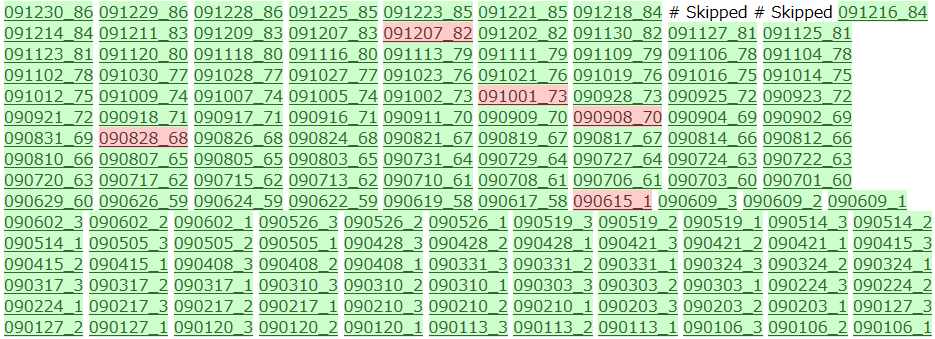 初めは一覧のテキストの文字列をエディタで置換を繰り返してMP3ファイルのURLを作ってみましたが、それを数年分行うのは面倒と思い、スクリプトを作ってみました。(後述)2008年のファイルはこれでほぼダウンロードできましたが、一部、ダウンロードされていないものがあります。一覧の文字列は意図したとおりにURLに変換できているので、どのファイルが存在しないのかを確認することにしました。