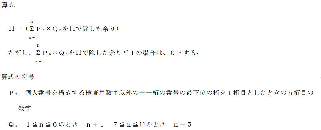 この番号は住所や出席番号のように、一つずらしたものが次の別の番号になってしまうようなことはないような仕組みがあるだろうなあと思っていましたが、チャットで話題にしたところ、その算出方法(総務省令第八十五号)が公開されていることを知りました。